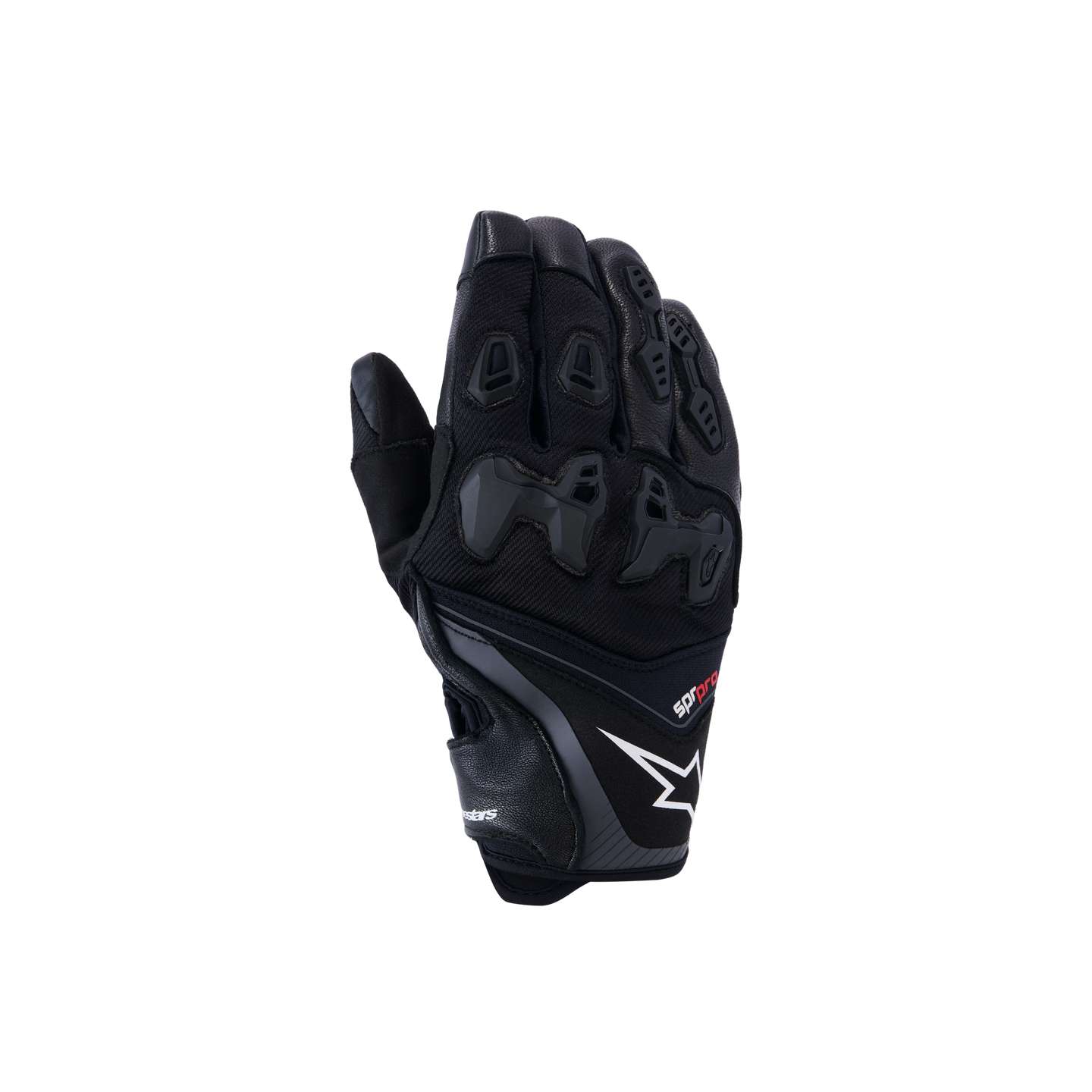 A short cuff sport riding glove, the SP-R Pro Glove is engineered for performance when riding supernaked and hypermotard bikes. Constructed from highly abrasion resistant, full grain goat leather and durable but lightweight textile material, its protective too thanks to its cutting edge MotoGP-derived SP-R divided knuckle. Equipped with Alpinestars patented finger bridge, and a new anatomically profiled grip insert on the palm and thumb, this versatile glove ensures an optimized performance riding fit and high levels of movement and comfort.