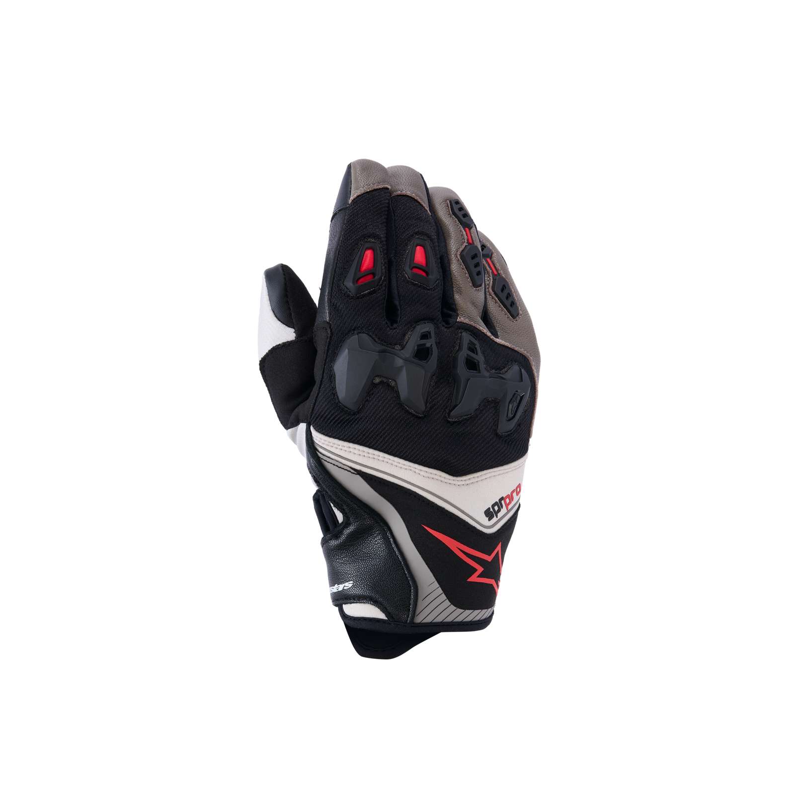 A short cuff sport riding glove, the SP-R Pro Glove is engineered for performance when riding supernaked and hypermotard bikes. Constructed from highly abrasion resistant, full grain goat leather and durable but lightweight textile material, its protective too thanks to its cutting edge MotoGP-derived SP-R divided knuckle. Equipped with Alpinestars patented finger bridge, and a new anatomically profiled grip insert on the palm and thumb, this versatile glove ensures an optimized performance riding fit and high levels of movement and comfort.
